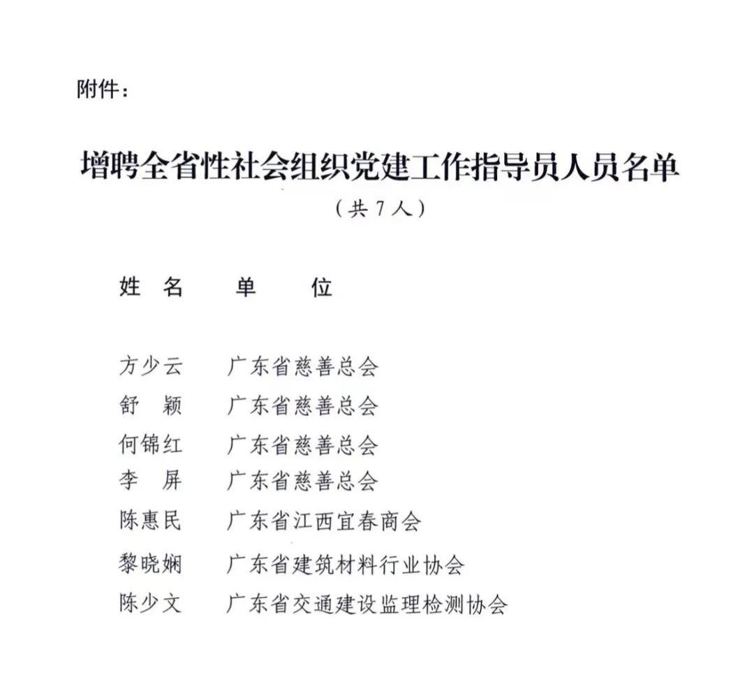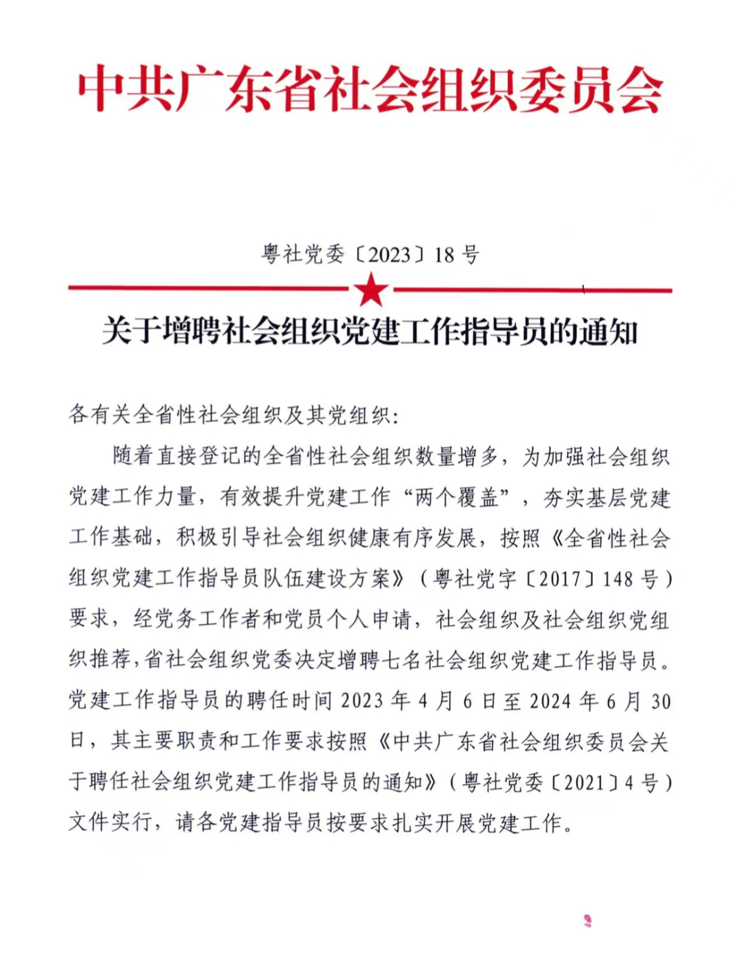 近日,省建材联合党支部委员黎晓娴同志被广东省社会组织党委增聘为“全省性社会组织党建工作指导员”。加上支部书记陈环、支部委员王卫国两位原有的指导员,我协会共有三位“全省性社会组织党建工作指导员”。