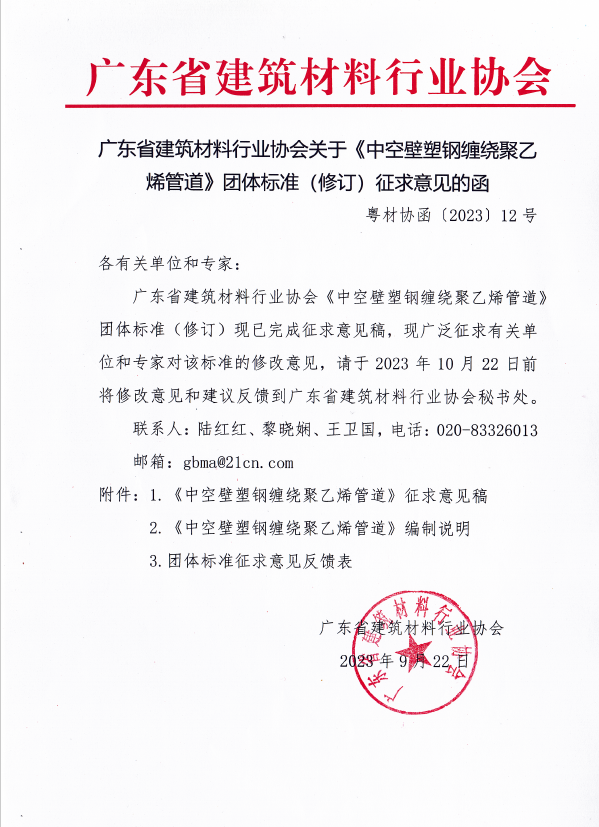 广东省建筑材料行业协会《中空壁塑钢缠绕聚乙烯管道》团体标准(修订)现已完成征求意见稿,现广泛征求有关单位和专家对该标准的修改意见,请于2023年10月22日前将修改意见和建议反馈到广东省建筑材料行业协会秘书处。