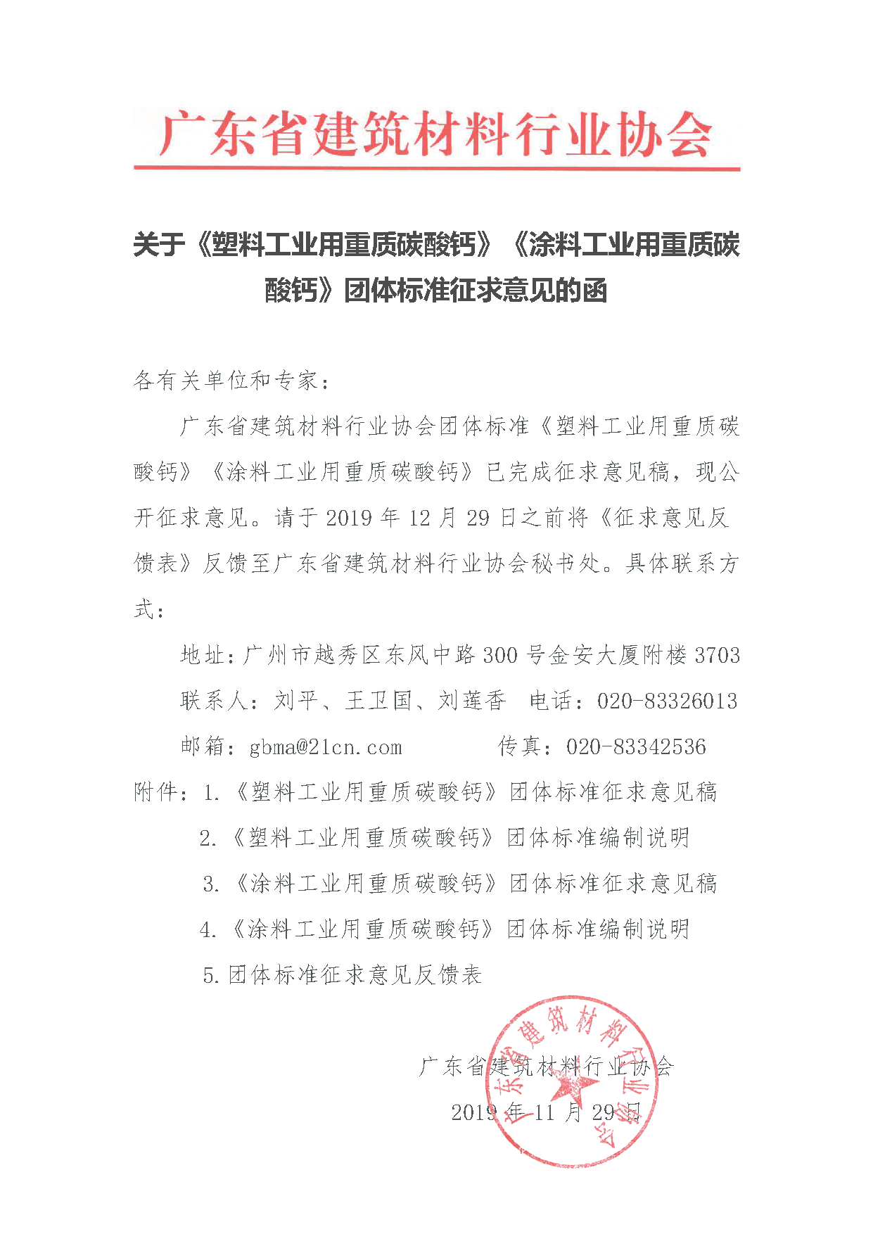 广东省建筑材料行业协会团体标准《塑料工业用重质碳酸钙》《涂料工业用重质碳酸钙》已完成征求意见稿,现公开征求意见。请于2019年12月29日之前将《征求意见反馈表》反馈至广东省建筑材料行业协会秘书处。具体联系方式:
