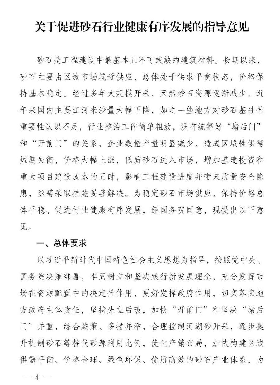 各省、自治区、直辖市及计划单列市人民政府,新疆生产建设兵团:为稳定砂石市场供应、保持价格总体平稳、促进行业健康有序发展,经国务院同意,现将《关于促进砂石行业健康有序发展的指导意见》印发你们,请认真组织落实。问:为什么要制定出台《指导意见》?